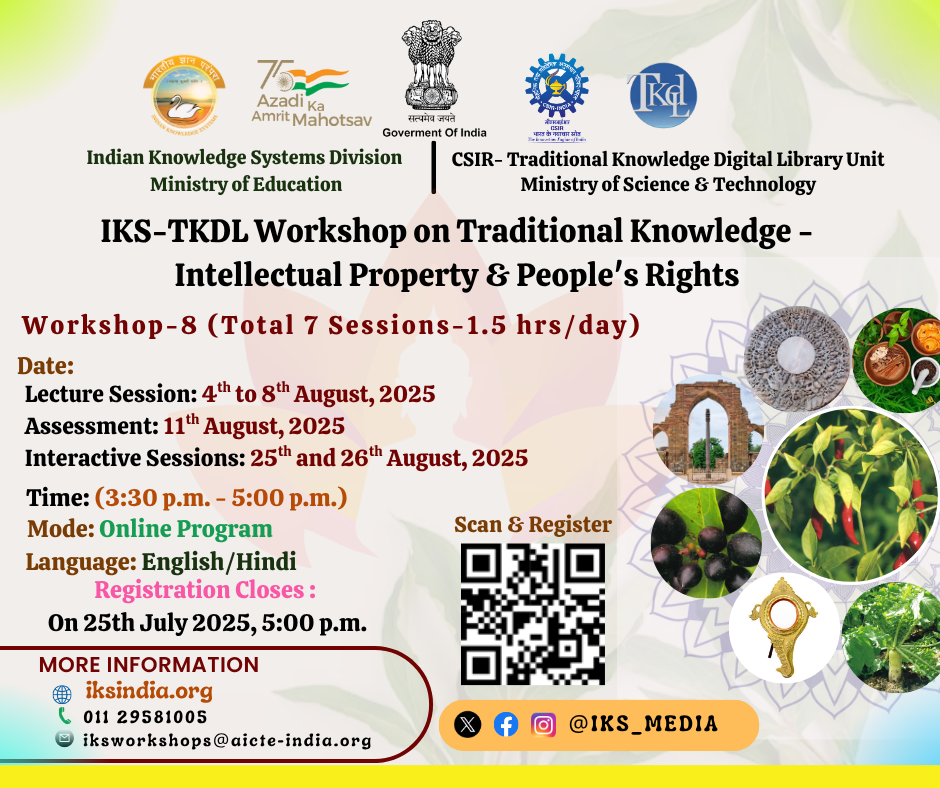We are pleased to announce next IKS-TKDL Workshop-8 on “Traditional Knowledge – Intellectual Property & People’s Rights” to be conducted online by the IKS Division in collaboration with the CSIR-TKDL Unit from 4th–8th, 11th & 25th–26th August 2025.