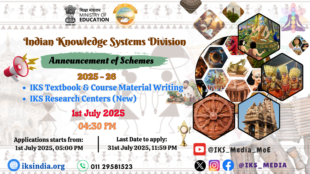 We are honoured to invite Prof. Anil Sahasrabudhe ji and Padmashri Chamu Krishna Shastri ji to officially announce the results of the above mentioned schemes on 30th March 2025 (Chaitra Maas Shukla Paksha Prathama Tithi) at 1:00 pm with Live Streaming on IKS Division Youtube Channel.